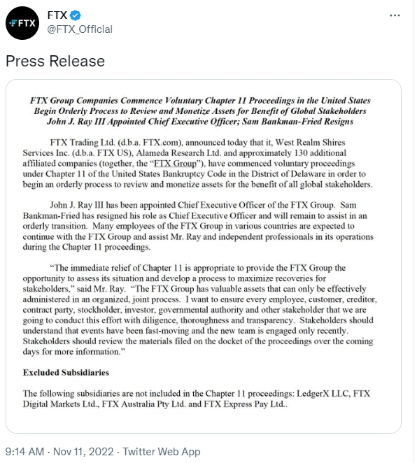 11일현지시간 블룸버그 등에 따르면 ftx는 미국 델라웨어주 법원에 미국 파산법 챕터 11에 따른. 2 days ago블룸버그 FTX 파산 피하기 힘들 것美 증권당국 조사 착수 미국의 증권 감독 당국인 증권거래위원회SEC가 최근 뱅크런bank run대규모 예금 인출.